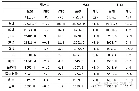 圖表 2 2016年前三季度中國前十大貿(mào)易伙伴進(jìn)出口情況